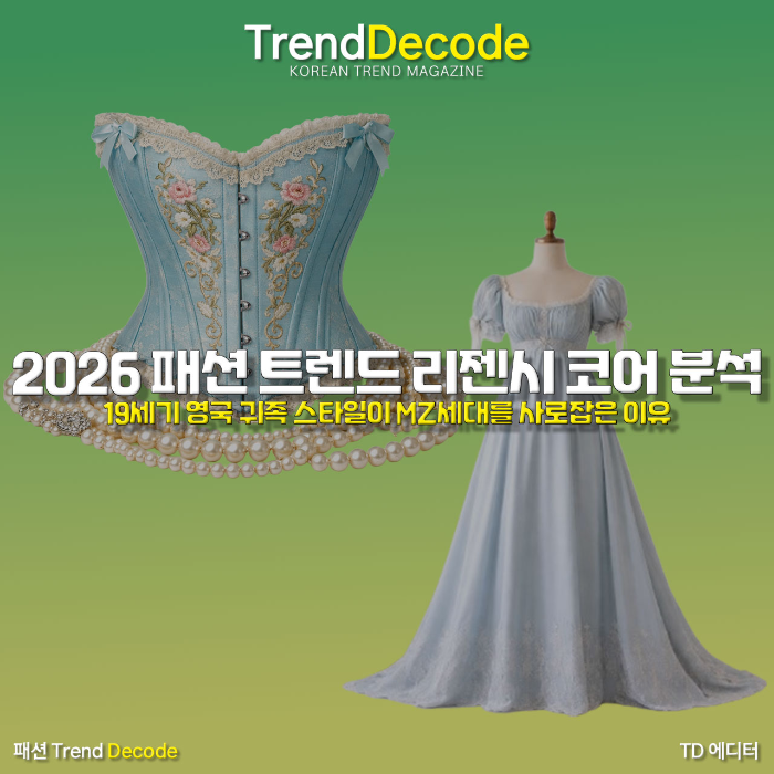 2026년 글로벌 패션 시장을 관통하는 가장 강력한 키워드는 단연 19세기 영국 귀족 스타일을 차용한 리젠시 코어다. 넷플릭스 드라마 브리저튼의 흥행과 함께 시작된 이 트렌드는 단순한 코스튬 놀이를 넘어 현대 패션 하우스의 핵심 실루엣으로 정착하며 거대한 경제적 파급력을 창출하고 있다. 엠파이어 웨이스트 라인 드레스와 코르셋 그리고 진주 액세서리로 대변되는 이 현상이 어떻게 밀레니얼과 Z세대의 가치 소비와 맞물려 하이엔드 시장을 장악했는지 상세한 지표를 통해 확인한다. 억압의 상징이었던 과거의 의복이 현대 여성들의 자기표현 수단으로 변모하는 심리적 기제를 분석하고 향후 2027년까지 이어질 리젠시 코어의 시장 전망을 분석한다.