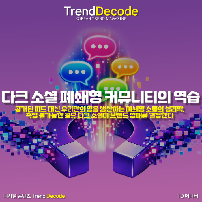 이러한 구조적 변화는 콘텐츠 제작 전략의 수정을 요구한다. 모든 사람을 만족시키려는 보편적인 콘텐츠는 다크 소셜 내에서 공유될 동력을 얻지 못한다. 오히려 특정 집단만이 이해할 수 있는 디테일한 설정과 코드 혹은 논란의 여지가 있는 독특한 시각이 담긴 콘텐츠가 폐쇄형 단톡방이나 게시판으로 퍼져나갈 가능성이 크다. 마케터들은 이제 측정 가능한 노출수나 클릭수에 매몰되기보다 우리 브랜드의 콘텐츠가 얼마나 많은 사람의 비공개 대화창으로 복사되어 붙여넣기 되는지를 고민해야 한다. 다크 소셜은 이제 숨겨진 시장이 아니라 브랜드의 생존을 결정하는 가장 실질적인 심판대가 되었다.
