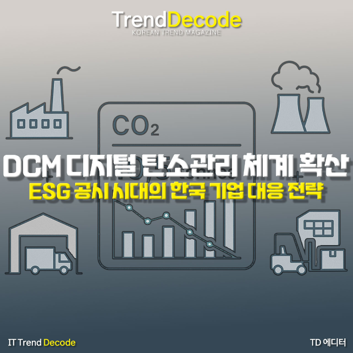 DCM 확산 배경에는 ESG 공시 체계 변화도 크게 작용하고 있는데, 글로벌 공시 기준은 자사 배출 Scope1과 간접 배출 Scope2뿐 아니라 공급망 전체의 Scope3 배출량까지 공개하도록 요구하는 방향으로 이동하고 있다. 이러한 구조에서 기업은 범위가 넓고 복잡한 데이터를 효율적으로 관리하기 위해 디지털 시스템을 활용할 필요가 생긴다. 한국 기업은 제조 유통 금융 공공 등 다양한 산업에서 공시 체계를 개편하며 DCM 시스템 필요성을 인식하고 있다.
