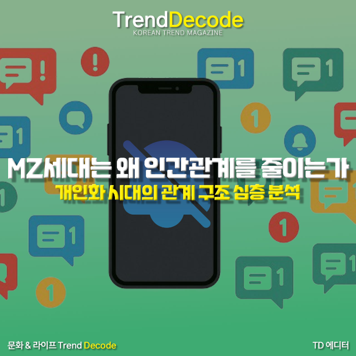 한국 MZ세대는 인간관계를 줄이는 방향으로 행동 패턴을 재구성하고 있으며 이러한 경향은 개인화된 생활 구조와 경제적 현실 환경이 결합된 결과로 나타난다. 관계 유지에 필요한 시간과 감정 자원이 한정된 상황에서 MZ세대는 필수적 관계만 유지하는 것이 효율적이라는 판단을 강화하고 있다. 디지털 소통의 피로감 증가와 주거 구조 변화도 함께 작용해 관계 폭을 넓히는 방식에서 벗어난 새로운 관계 전략이 형성되고 있다. 이 글에서는 관계 축소가 단순한 개인 성향이 아닌 사회문화적 구조 변화의 결과임을 데이터 기반 분석을 통해 설명한다.